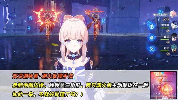 11-2上半、12-1上半、12-3上半都有深渊咏者·渊火,因此本期深渊上半队伍推荐至少带一个水系角色,用于消解元素盾。其中11-2上半、12-3上半都有2只渊火,若队伍水系角色不具备超大范围挂水能力,建议走到地图边缘,使敌我呈三角形站位,迫使渊火主动靠前,以此来实现聚怪效果。逐个击破也能打,就是耗时较多,此时压力就来到下半场了~
