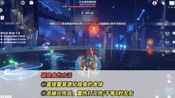使其从隐身状态显形有3种方式:①直接寻找到隐身的本体,用雷草激化,使其瘫痪显形。②打破召唤的元件,元件会进入修复状态,用雷伤击打修复元件直接瘫痪显形;③打破召唤的元件,等候8秒左右本体会出现。从显形到下一次再次隐型,期间有至少10秒的输出时间,各种技能大胆放。