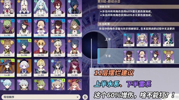 【11层上半】队伍存在至少1位破盾优势的水系角色即可,心海、芭芭拉、莫娜、行秋、夜兰等等。担忧镇石翻车,可以搭配,温迪、万叶、砂糖、琳妮特等控场角色。