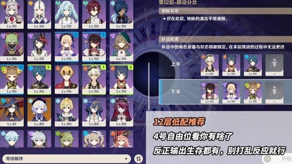 【12层上半】皆为多波次、多目标敌人,建议转火能力强的队伍(非纯爆发类型、非个体标记类型、非小圈作战类型)。且存在较多火盾敌人,队伍内建议至少1位破盾优势的水系角色。“超低配推荐:班尼特、香菱、行秋、自由位。”