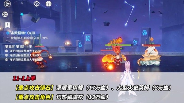 经典失误场,11-1镇石。主要关注上半,坚盾重甲蟹(17万血)、大型火史莱姆(8万血)都会重点攻击镇石,优先处理!炽热骗骗花(13万血)能够吸引到仇恨就无需担忧了,会追着你打。