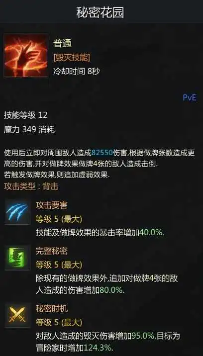 黄技能带来的爆伤BUFF甚至可以看成红技能的第四排三脚架,卡牌的输出机制以及三脚架都突出了暴力两个字。但最终成型的卡牌大师也并没有完全碾压了别的职业,卡牌大师的三脚架增伤相互独立既是好事也是坏事。首先这意味着基础伤害会非常的低,因为卡牌大师的伤害全部来源于毁灭伤害,而毁灭伤害跟红技能的三脚架挂钩(第二个知识,卡牌红技能的等级并不会影响毁灭伤害),你红技能的三脚架每少一级,就相当于别的职业所有的输出技能都少了一级,所以起了卡牌的人会觉得卡牌的伤害在前期比较低。