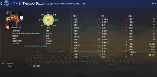 蒂亚戈-席尔瓦曾被称为“世界第一中卫”,虽然随着年龄增大,状态对比巅峰时有一定程度的下滑,但他依然是世界足坛最好的中卫之一,他的防守三项,站位、盯人、抢断分别为16、17、16,作为一名老将,他的精神属性非常出色,工作投入16,集中16,决断15,领导力14,侵略性16,意志力17,勇敢15,预判16,镇定15。虽然年龄偏大,但席尔瓦的身体素质并没有明显下降。速度14,爆发13,灵活13,耐力15,平衡16,强壮15,比较标准的中卫属性。