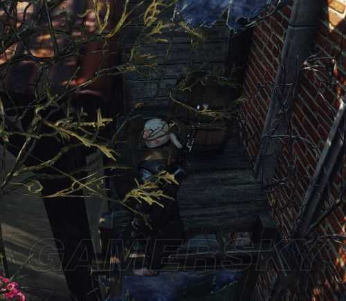 首先到圆桶那里,跳上去,然后左转跳到房子上面,往前走一点,右转跳到另外的房子上面,继续走就可以下去了。