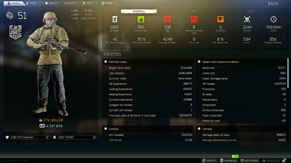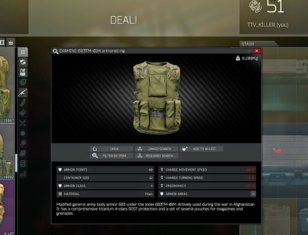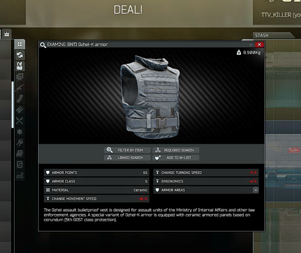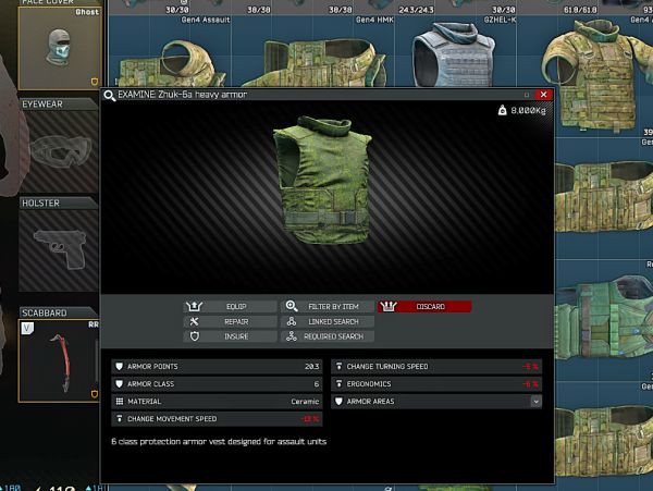 建议大家尽量别穿俄重,首先他减了太多转身速度,然你有时候拉枪很不习惯。 第二如果力量耐力等级不高,你根本跑不掉跳不动。 ZHUK-6 让你带着俄重的防御力蹦蹦跳跳。