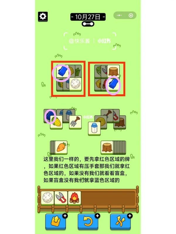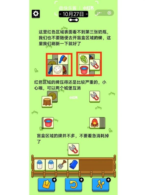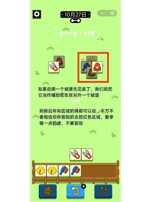 5、卡槽里牌少我们就挖红色区域能消的牌,卡槽里牌多,我们就利用非红色区域的牌清一下卡槽然后继续去挖红色区域的牌