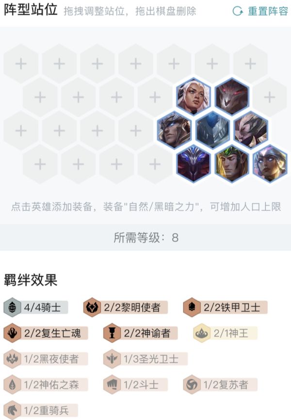 初步构想:4屠龙:铁男、皎月、巨魔、潘森,4黎明:卡尔玛、锐雯、豹女、螳螂,由此凑成的羁绊是4屠龙4黎明3神盾2征服者2刺客,但这几张黎明的单卡太废了,2刺2征服者的小羁绊也并不强,3神盾下的豹女也不出色。