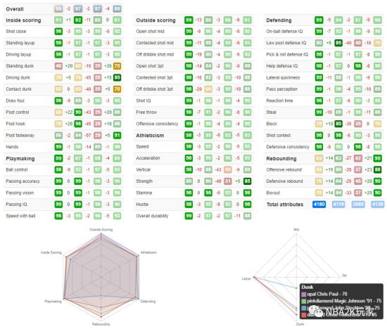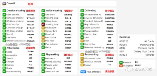 这张保罗的属性简直爆炸,总值高达4180,六大项中有五项高光!唯一的一项黄区为篮板能力。