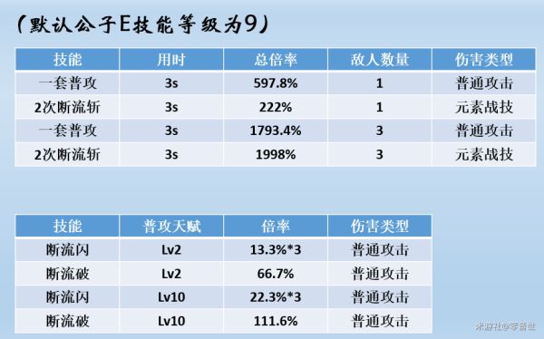 (以下数值默认公子E技能等级为9),公子完成一套普攻大约需要3s,总倍率为597.8%,期间会触发2次断流斩,总倍率为222%。
