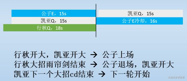 1命公子e技能持续15s时冷却时间约为16s,我们可以根据行秋雨帘剑是否存在来判定公子退场的时间,2命行秋大招雨帘剑持续18s,多出的3s可以留给凯亚开大或行秋释放E技能;公子退场后,凯亚立即开启大招,cd为15s,期间其他角色放技能外加凯亚普攻。等到凯亚大招的cd冷却结束的时候,公子E技能的cd也结束了。