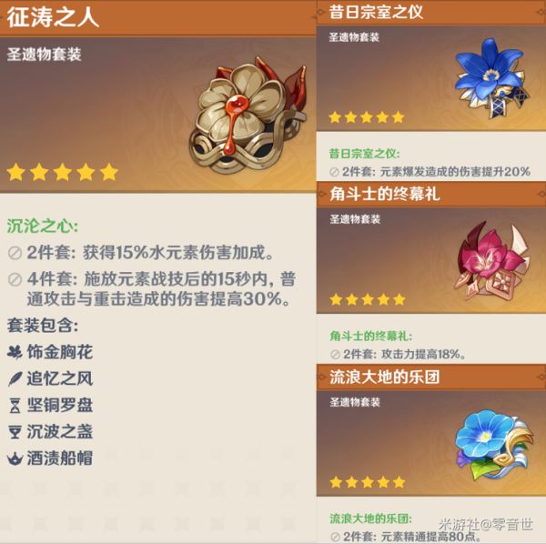 圣遗物:核爆流选择2水2宗室(词条较好的角斗士/乐团),近战输出选择水4。作为一个前台输出的主C,双暴是肯定要的,攻击也有收益,充能方面靠别的角色足够。