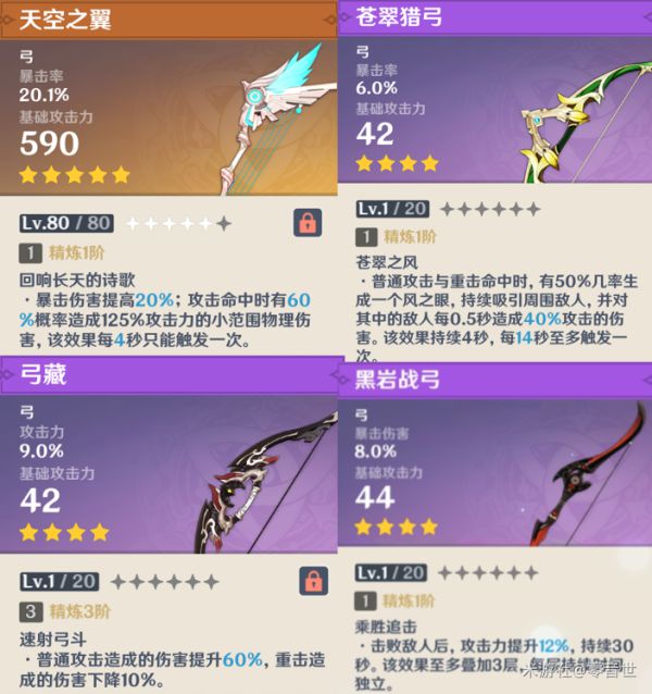 武器:五星武器首选天空之翼,四星武器首选弓藏,二者都没有的考虑纪行的苍翠猎弓和商店的黑岩战弓。阿莫斯有的话可以用,但没有必要为了公子强抽。