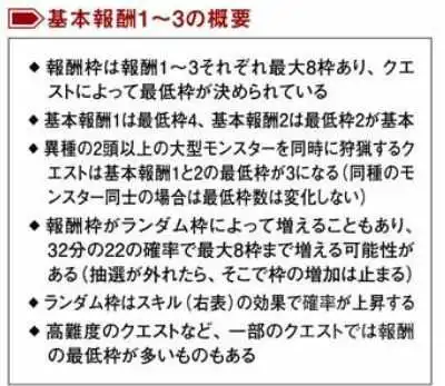 对于只有一个狩猎目标的任务,每类报酬的数量至少为4格,按照一定概率进行若干次抽选是否会+1,至多8格。两者合计最少8格,最多(理论上)16格