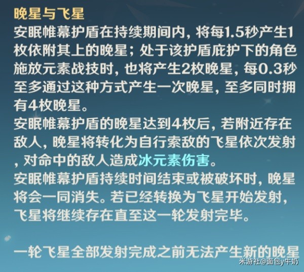 在护盾的状态下,产生晚星,集齐四枚晚星后变成飞星发射,造成冰元素伤害。