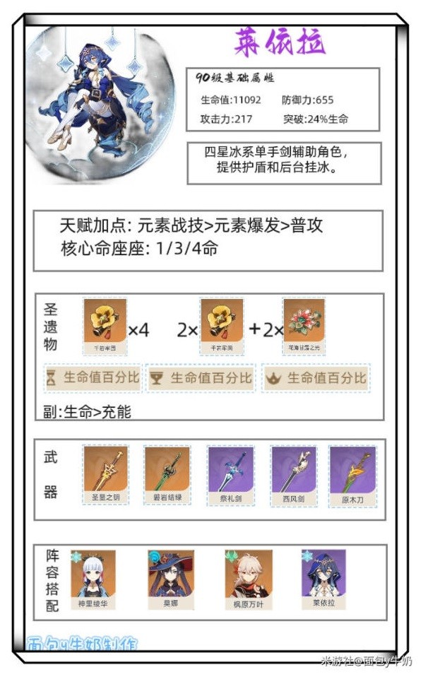 《原神》莱依拉是一个四星辅助角色,很多玩家想要知道她该如何培养,下面请看“面包y牛奶”带来的《原神》莱依拉装备搭配推荐,希望能够帮助大家。