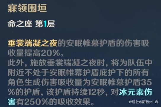 元素战技是莱依拉的核心天赋技能。莱依拉释放元素战技,获得护盾,造成冰元素伤害。护盾的伤害吸收量与莱依拉的生命值上限挂钩。