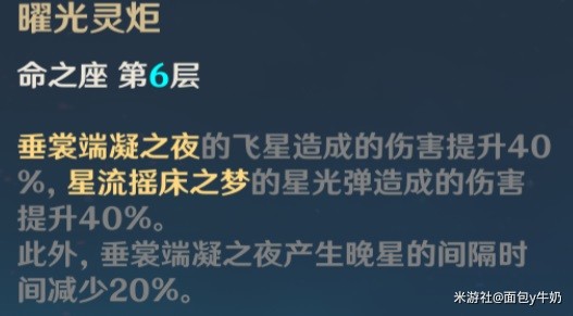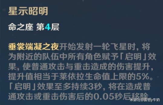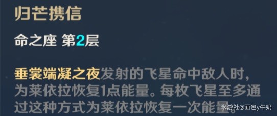 解锁该天赋后,飞星伤害提高,依据莱依拉生命值的1.5%。