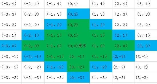 其中绿色的格子,因为其距离处在AddionFailRadius=2以内,其聚灵数值不变仍为AddionLing,而蓝色格子,其距离因为大于AddionFailRadius=2,其聚灵数值将变为:value=AddionLing*AddionFailing^(到灵木的距离-AddionFailRadius),周围白色格子,由于距离超出了AddionRadius,其聚灵值为0。