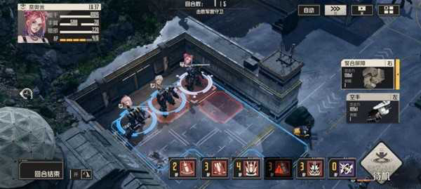这一回合,格兰特,凯登、赛文这三个在第二回合就已经移动到目标附近的机兵,直接开始往右手边第一个炮台移动,然后能攻击炮塔的直接台。凯瑟琳在这一回合最远距离移动,可以刚好移动到“军营守卫”旁边,之后再把所有的攻击都打在主要目标身上。奈奥米也是最远距离移动,然后用远程单体导弹攻击“军营守卫”就可以了。