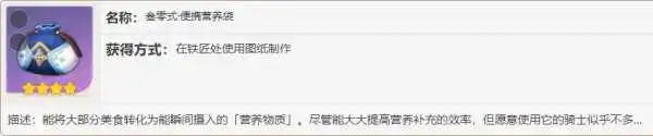 【蒙德声望等级5解锁】便携式营养袋:可以帮助玩家快速回复血量或者食用带有buff加成的食物,必要时可以准备复活用食物。
