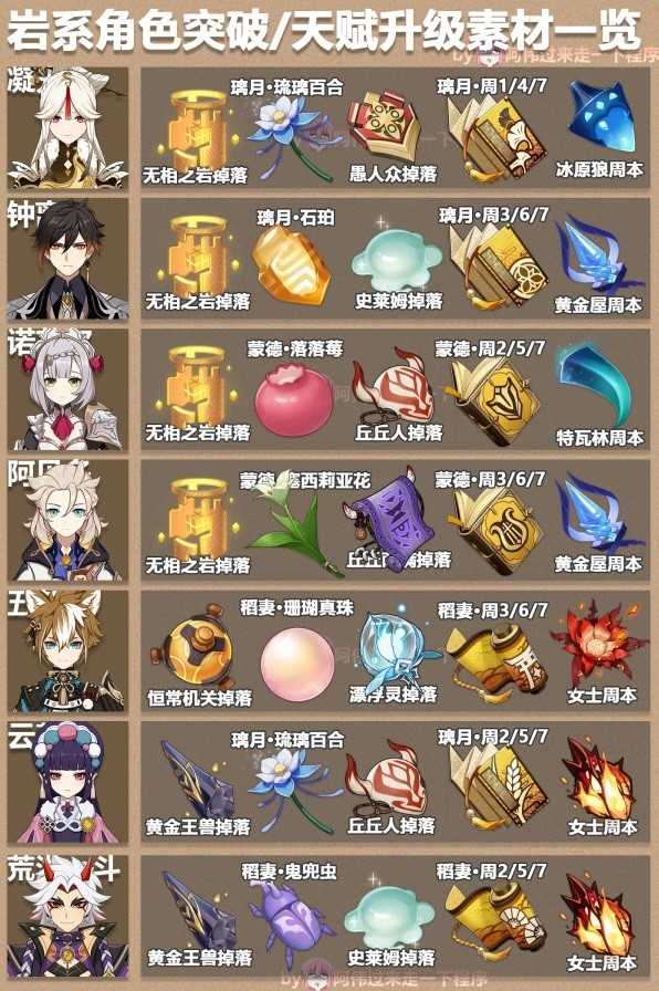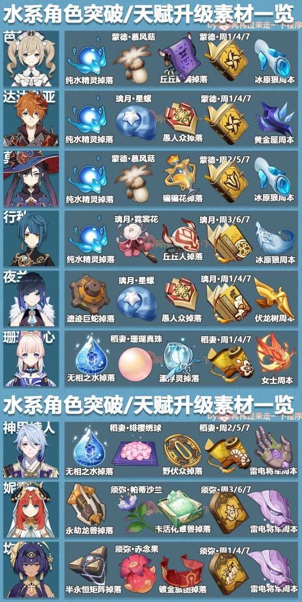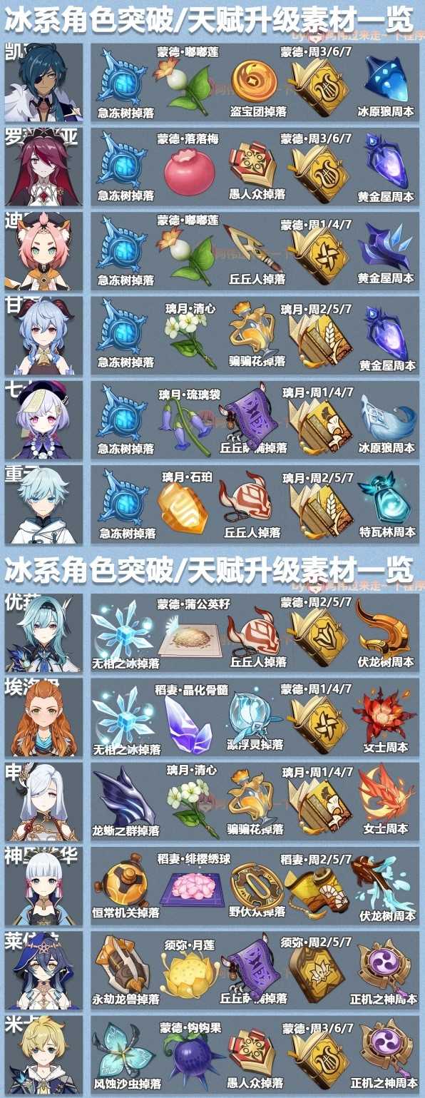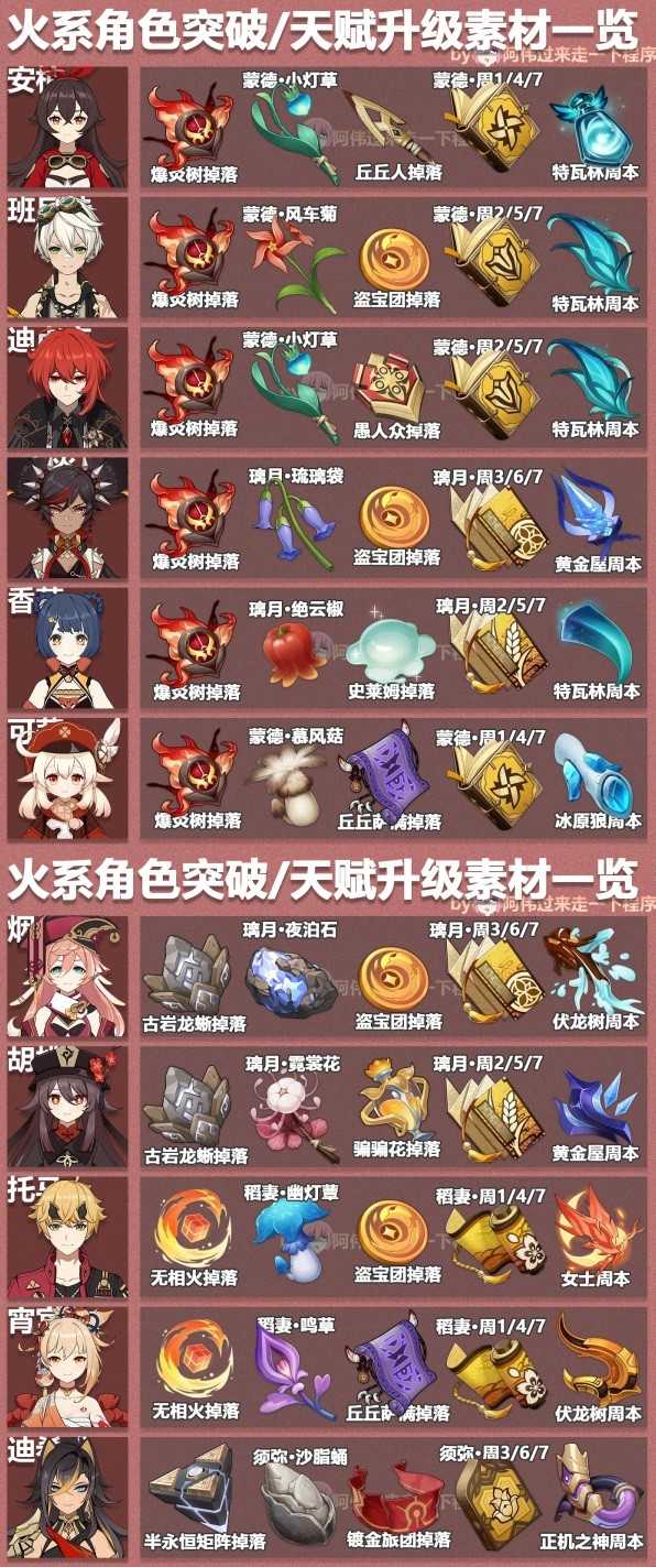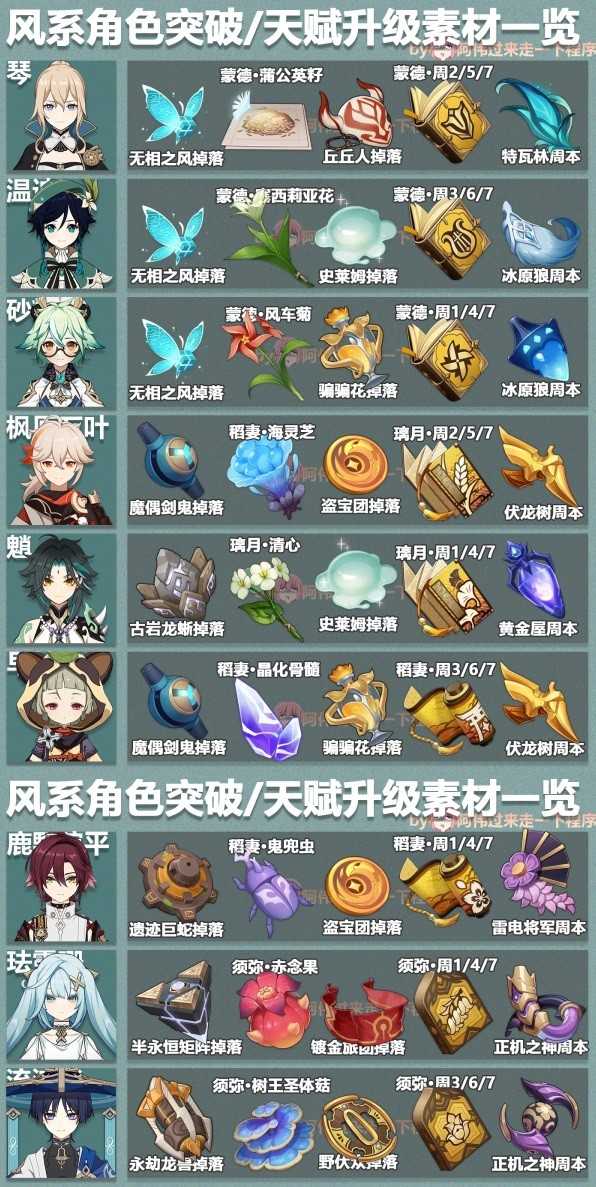 《原神》中各个角色的培养素材需求不同,想要更加完整表格对照的玩家请看下面“阿伟过来走一下程序”带来的《原神》3.6版本全角色突破素材表,希望能够帮助大家。