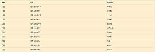 以下怪物均为贯通轻弩狩猎优质怪,可根据需要的怪异化材料选择狩猎对象。