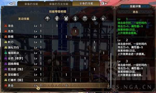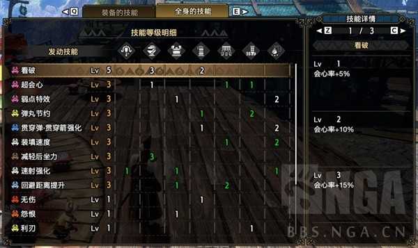 2.优质推荐出满技能:弱点特效3级,超会心3级,看破6级,攻击7级。