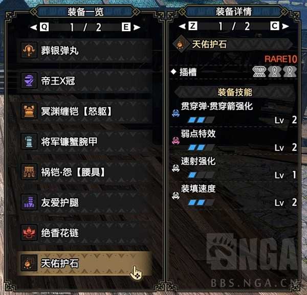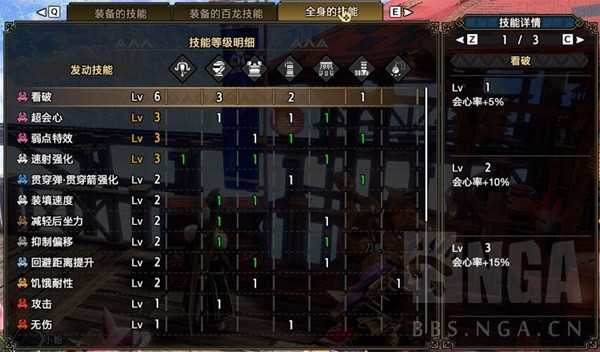 整体配装思路为:看破6的30会心+狂龙症20会心+弱特3的50会心即可达到满会,在满足贯通弹强化3级,速射强化3级,快速装填2级,减轻后坐力2级,回避距离提升2级,弱点特效3级,超会心3级,看破6级的前提下,根据怪异化结果的不同,调整技能珠来尽可能的堆高攻击技能。