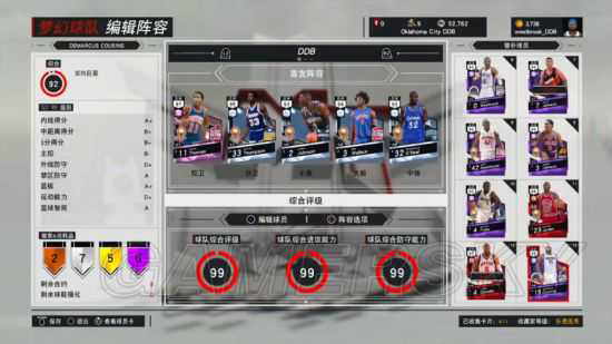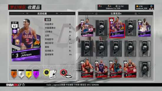 区域4,可抽卡堆:目前可以抽到的卡分别有得分卡,技术犯规,若干现役球员和战贴专属奖励球员,球衣,球鞋,增加卡片,硬币卡(分别有175,200,5001000mt)徽章,合同,伤病卡
