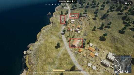 这个地方由上下两个部分组成,上面是一个大仓库和一片房区组成。下面也是一些很常见的房型,组成的一片房区。其中值得我们重点搜的地方是,城头的加油站,上面区域的大仓,海边的小餐厅。