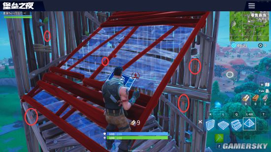 继续说屋顶,屋顶是一个可以跨1-2层板距离来搭建的板子,通过改变低头、抬头的视野可以在不同高度搭建来阻止敌人的搭高、前进。而且屋顶是编辑种类最多的一个特殊板,建议大家在实战中多多使用,养成习惯。