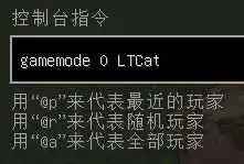 举一个例子:下面这个命令就是把LTCat的游戏模式改为生存模式的,相信大家熟悉吧。命令方块的命令输入不需要像直接打那样加“/”,但是必须要有一个“目标”(如“gamemode 0”不行,而需要“gamemode 0 LTCat”)。