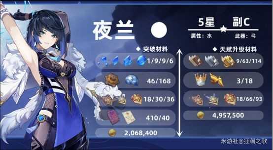 根据夜兰的元素类型和所在地域是璃月,可以推测出所需的所有材料,现在用得最少的基本就是她的了,各位旅行者可以提前准备了哦,如果不准记得来刀我。
