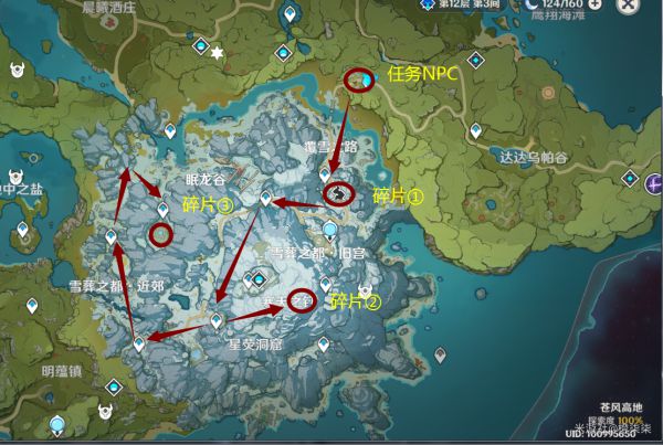 碎片②需要从传送点进入星荧洞窟,一路进入星荧洞窟,碎片位置在星荧洞窟最底层,启动限时机关,击败三波丘丘人+一波冰巫师,即可开启碎片的防护罩,拾取深赤之石打碎片即可。