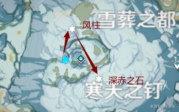 这里推荐一个最笨的方法(不知道有没有其他的深赤之石),来到山顶最上方,使用风元素开启风柱,然后来到对面可以找到深赤之石,一个一个运下去击破碎片,来回三次即可。