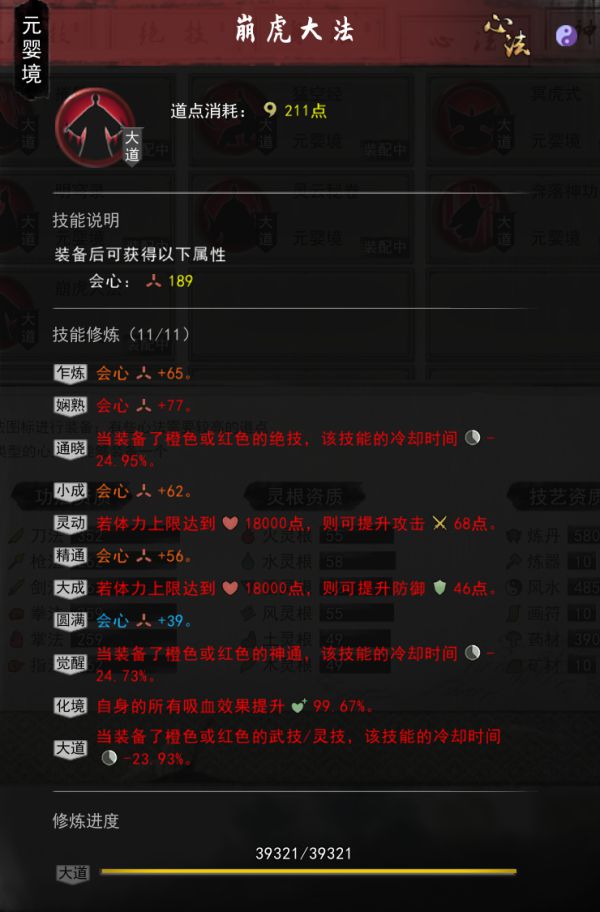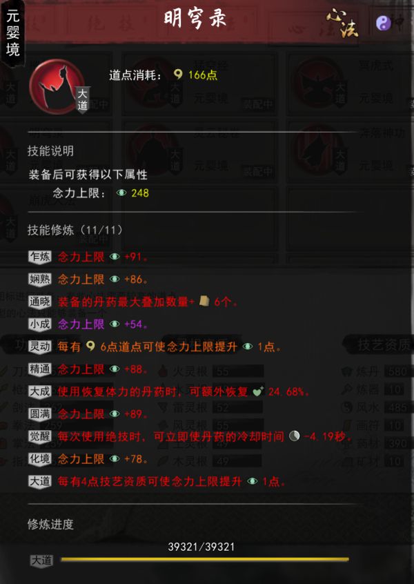 念力心法是续航的关键,丹药数量,和增加额外回复必须要刷到红,每次使用绝技减少丹药冷却到紫色就可以了,基本可以保证药的CD在5秒左右,念力突破3400后可以使用化神丹药,所以提升念力是最最重要的,至于灵力的心法,不要装备,打架前清保证灵力清空!