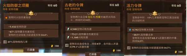 宠物装备词缀选择:如果选择宠物对闪电伤害免疫的传奇特效,则不用再堆宠物闪电防御(浪费宝贵的词条位置);宠物的主动技能冷却速度加快15%;宠物的属性伤害没太大用处,任意即可(当然闪电伤害锦上添花);;宠物格挡率/暴击率/暴击伤害的面板显示低于词条上的数值,加成不明显,不用特意去堆。附魔优先选择附加各种元素异常特效(流血,中毒,燃烧,电击,寒霜,定身,击退),或者弥补上述缺失的词条