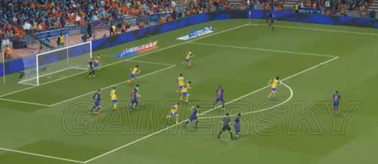 5、提早按射门键,射门力量20-40%之间,射门方向自由控制,近角的命中率会大幅度高于远角。