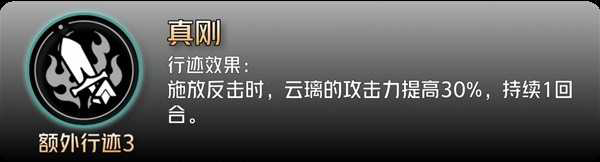 云璃施放所有反击类型的攻击都可以触发该额外行迹,战技和普攻也都可以吃到增益效果,由于云璃的反击频率非常高,所以基本可以视为常驻30%攻击力。