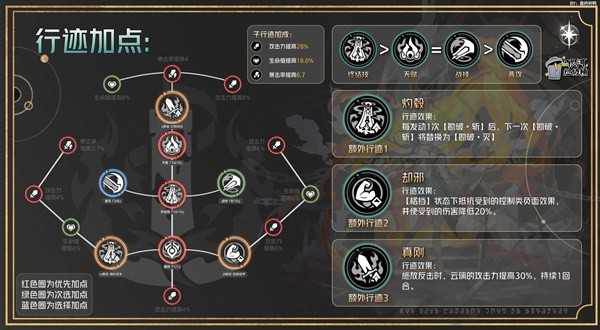 终结技须优先加点——终结技的行迹越高,提供的伤害增益越多,最高为主目标220%攻击力,相邻目标110%攻击力以及每段72%攻击力(共计6段)的伤害。倍率相当高
