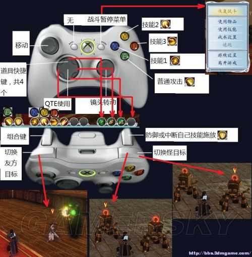 QTE出现后必须使用十字方向对应键,摇杆均无效。平时战斗中十字方向键用于快捷使用道具。所有技能、道具位置可调整,此处仅示例。友方切换这个,现在只有1个队员无法切换,将来有3人或以上战斗,应该可以切换,用来治疗的吧。防御键可以中断自己施放的技能。(中断后,似乎还一部分神回来,还有待测试)