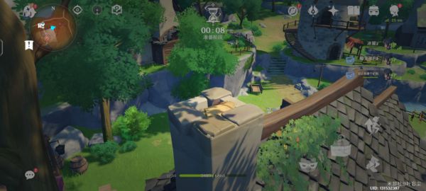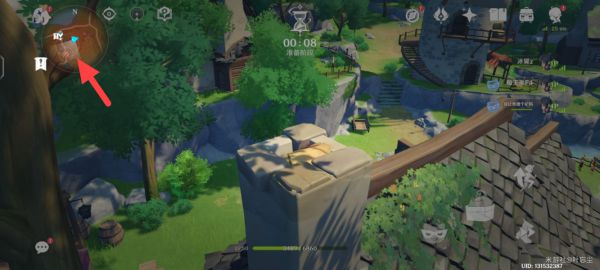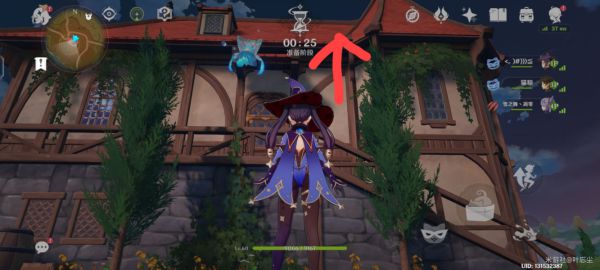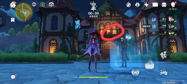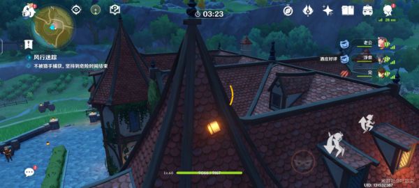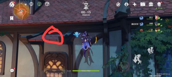 如果地图是蒙德酒庄,我们可以藏在酒庄中间的房子上面右边的尖塔上面。如下图所示,我们可以变成一盏小灯贴在上面。