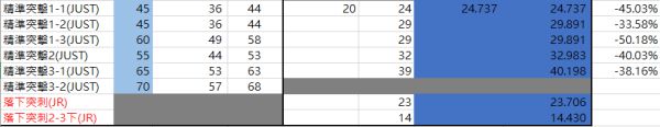 可以看得出来精准突击的动作值被下修非常多,在非大破绽下的使用价值下滑了不少。即便有了盾反JR,但因为需要防性的关系,目前体验版的环境下还是不太有利。