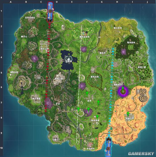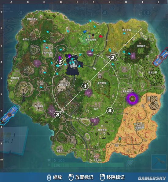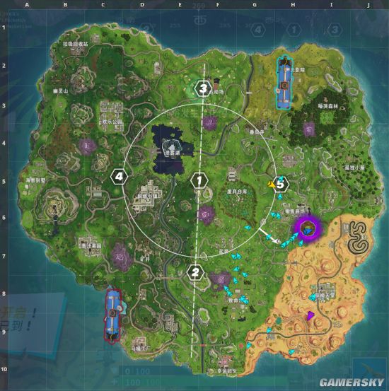 我方为青色方,航线为青色,巴士刚刚到达沙漠地区上空我们便可以下车了,敌方的巴士是从垃圾回收站附近开过来的,同样是抢2号舞台,我们会先一步到达,5号舞台在我们这一边,是我们的老家,肯定要占下来,1号舞台的争夺则要交由主力部队来完成了,拼的就是哪只队伍的综合实力更强。
