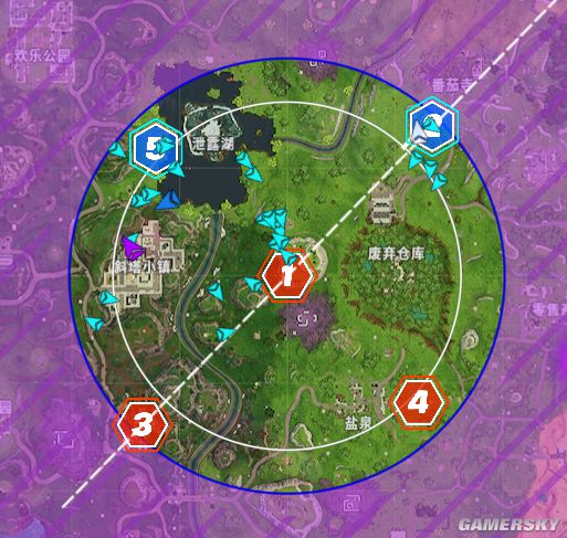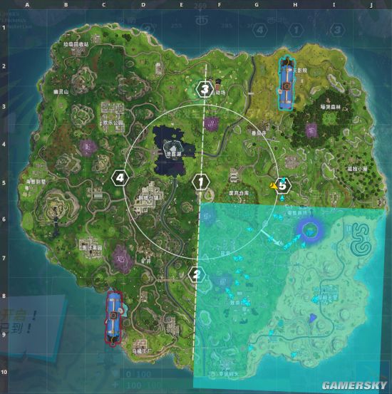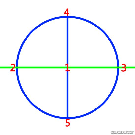 绿线为两只队伍的中线(白色虚线),蓝圈为安全区,舞台1会刷新在安全区中心点,而23两个舞台则会刷新在安全区外的中线上,2345四个舞台到舞台1的直线距离基本相同。