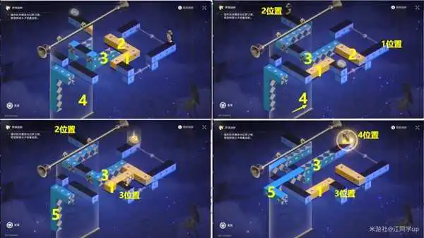 (3)将1黄模块移到左下,将3蓝色模块旋转1次,将5蓝色模块旋转3次,【钟表小子】会从位置3到位置4,解密完成