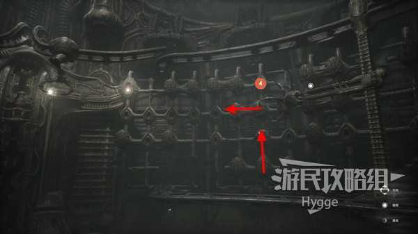 来到下图所示房间后左侧的门同样无法打开,需要从右侧的通道向下。