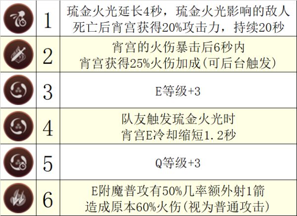 2命:近乎常驻25%火伤加成,完美适配E和Q都不锁面板。但需注意,宵宫的适配武器和圣遗物必然导致增伤区爆炸,25%火伤大约等于10%的总伤害提升。