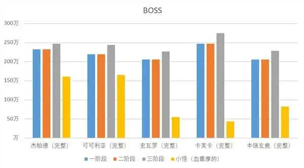 最后把本次活动的BOSS总和对比一下,小怪只算了血量最厚的一个,毕竟除了卡芙卡都能不断召唤的,BOSS血量在630万-770万,每个阶段都是200万