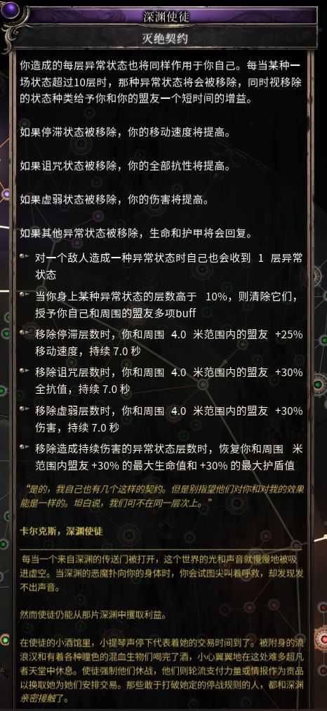 这个天赋非常强悍,有清除自身dot和debuff的作用,也有大量恢复,但是目前有几个bug(会使怪物伤害穿透你的护盾,移除虚弱后并不会+30%伤害, 移速全抗我还没试),不过没有关系,我们需要的是造成dot反射自身这一机制,让我们身上常驻自己打出来的dot。
